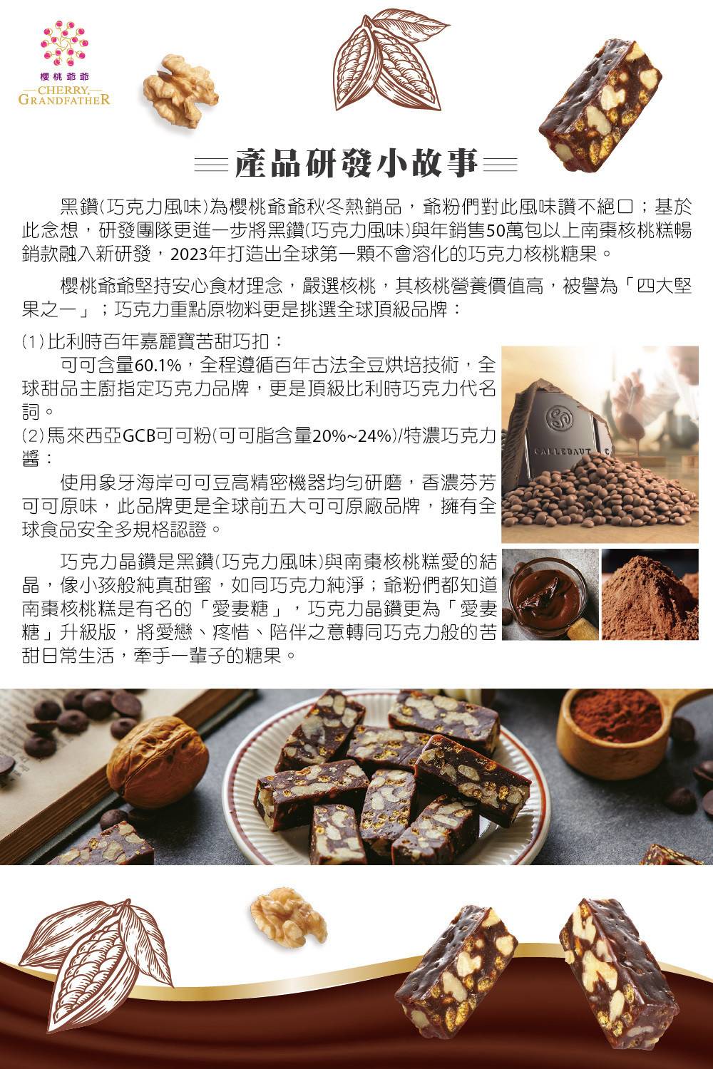 嚴選5大全球頂級原料,20年以上製糖經驗老師傅全程監測熬煮,部分糖體費時手工揉捏,精準掌握工法,2023年全球首創巧克力核桃糖果甜蜜上市。