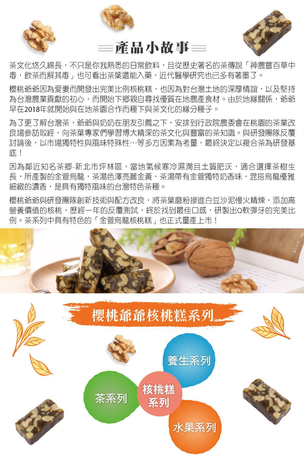 「櫻桃爺爺」嚴選高品質金萱烏龍茶為基底,添加核桃、白豆沙泥與日本海藻糖降低甜度,完美比例製成,一次可品嚐到兩種鮮醇茶香混搭爽脆核桃果仁等多重風味,讓您在悠閒或聚會時光裡,有如進入一片寬闊茶園,陽光照射下,舒服自在輕鬆!