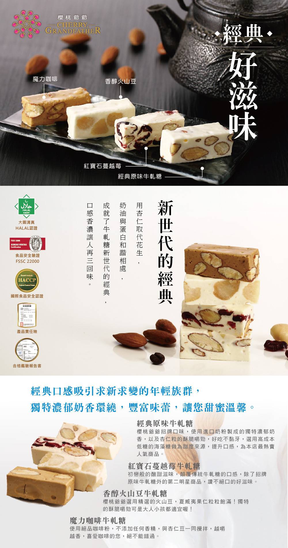 櫻桃爺爺,牛軋糖,手工,伴手禮,春節送禮,年糖,加州杏仁,紐西蘭奶粉,紐西蘭,美國蔓越莓,蔓越莓,Halal清真認證,素食,穆斯林甜點,超級食物,火山豆,番薯,地瓜,伴手哩,中秋送禮