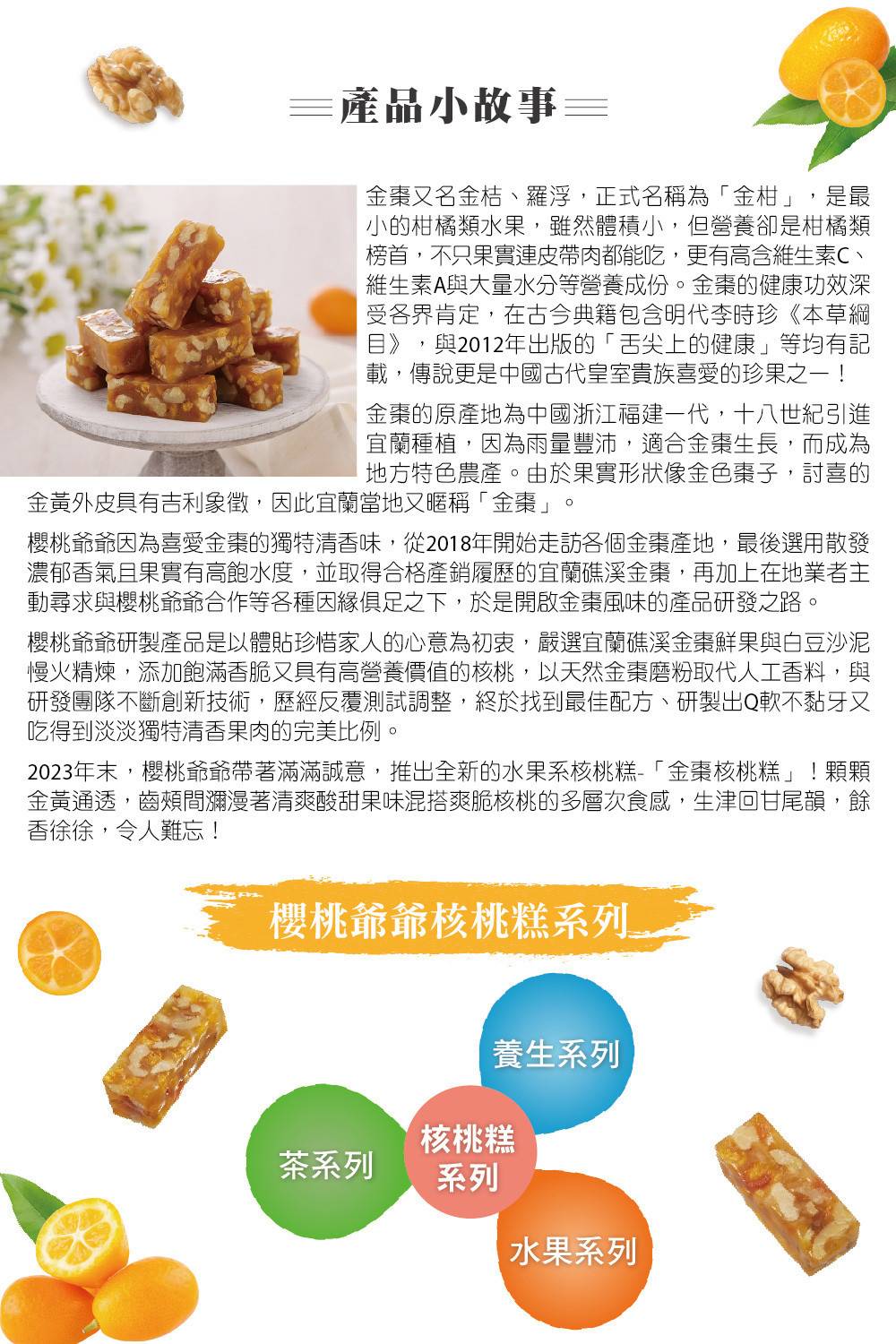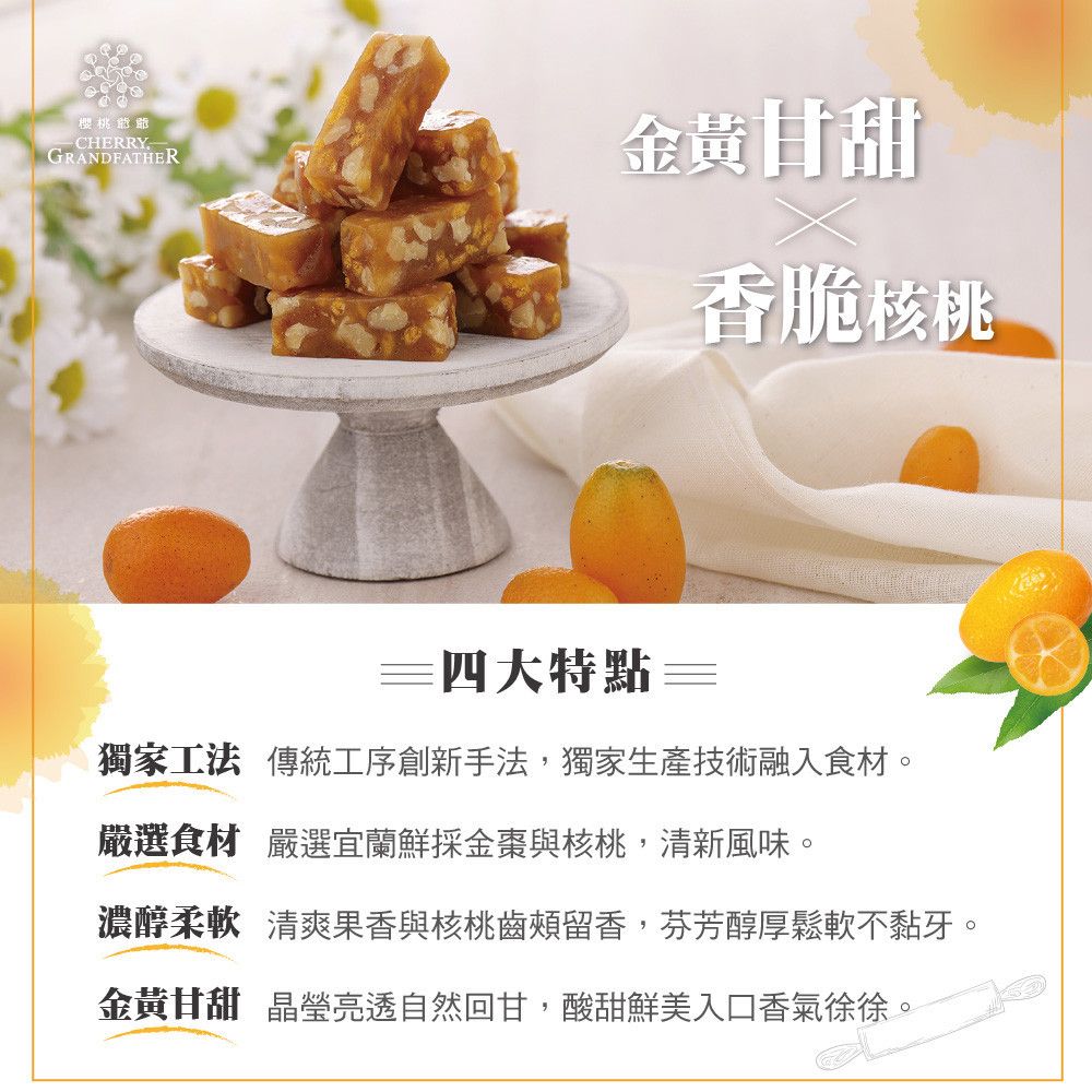 嚴選來自宜蘭縣礁溪鄉具有合格產銷履歷,清爽甘甜的新鮮金棗,以完美比例添加核桃、白豆沙泥與低甜度的日本海藻糖,以獨特創新的生產技術,製成顆顆金黃通透的金棗核桃糕。