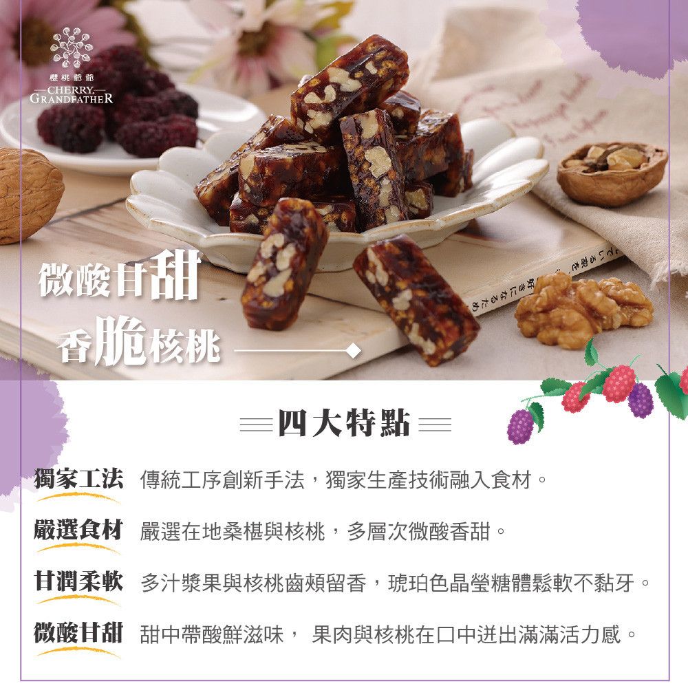 嚴選在地桑椹鮮採冷凍直送工廠,碩大飽滿桑果混搭金鑽鳳梨果肉熬製獨特雙果餡,添加飽滿爽脆的核桃與白豆沙慢火細熬,拌入低甜度日本海藻糖;每一顆都吃得到桑椹餡與核桃果仁,多層次微酸甘甜混搭爽脆核果香氣的豐富食感,Q軟彈牙、減糖不減美味,令人驚豔的難忘滋味。