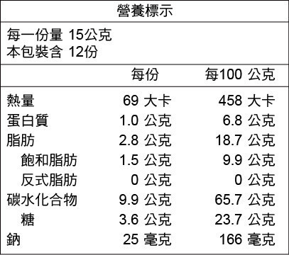 成份:餅乾(麵粉、棕櫚油、食鹽、砂糖、酵母、碳酸氫鈉〔小蘇打〕)、百香果餡(鳳梨、百香果汁、麥芽糖、砂糖、奶油、檸檬汁、鹽)、麥芽糖、砂糖、奶粉、奶油、百香果汁、蛋白、檸檬汁、玉米糖膠、鹽