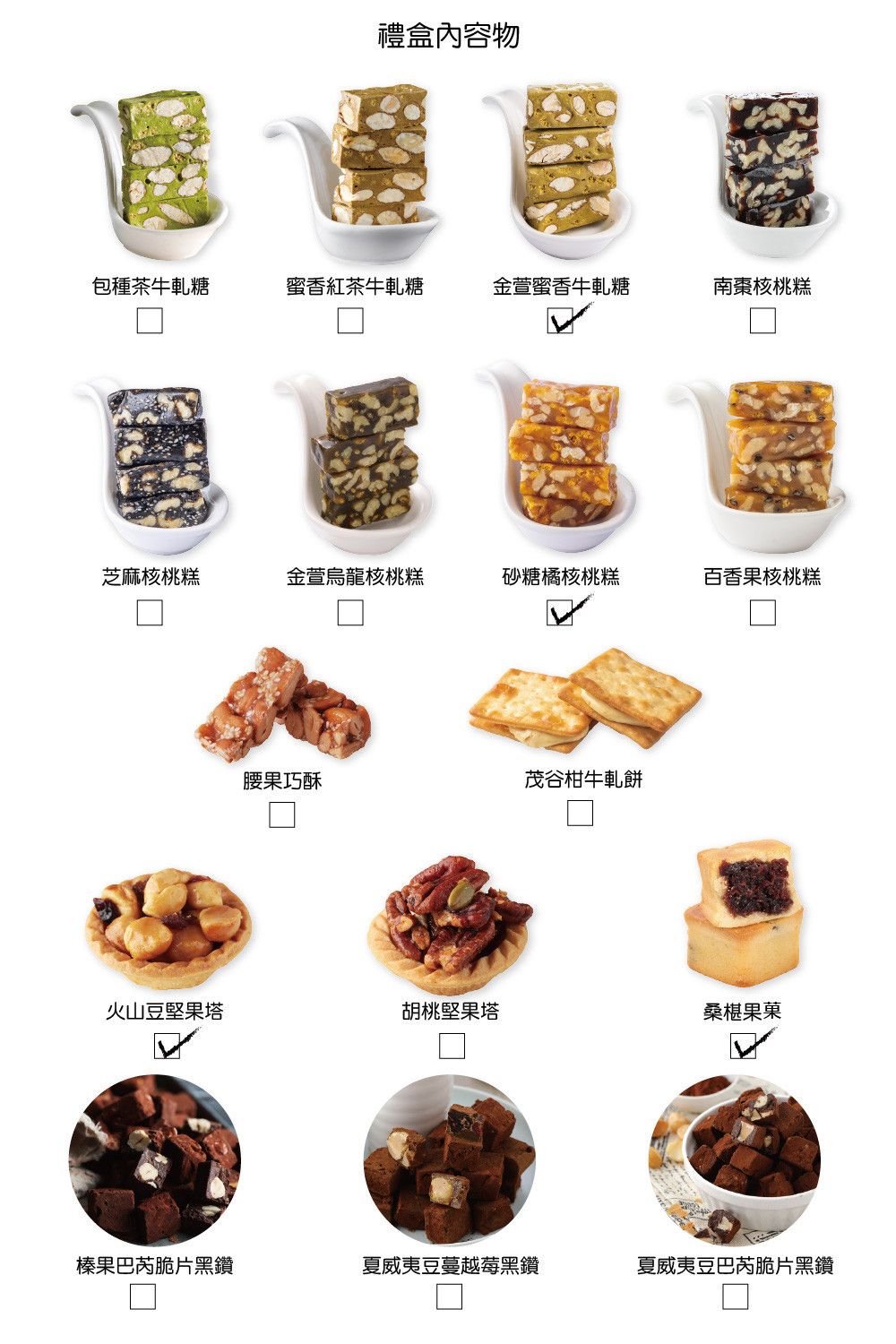內容物:夏威夷火山豆堅果塔x1+金萱蜜香牛軋糖100gx1+砂糖橘核桃糕100gx1+桑椹果菓110gx1