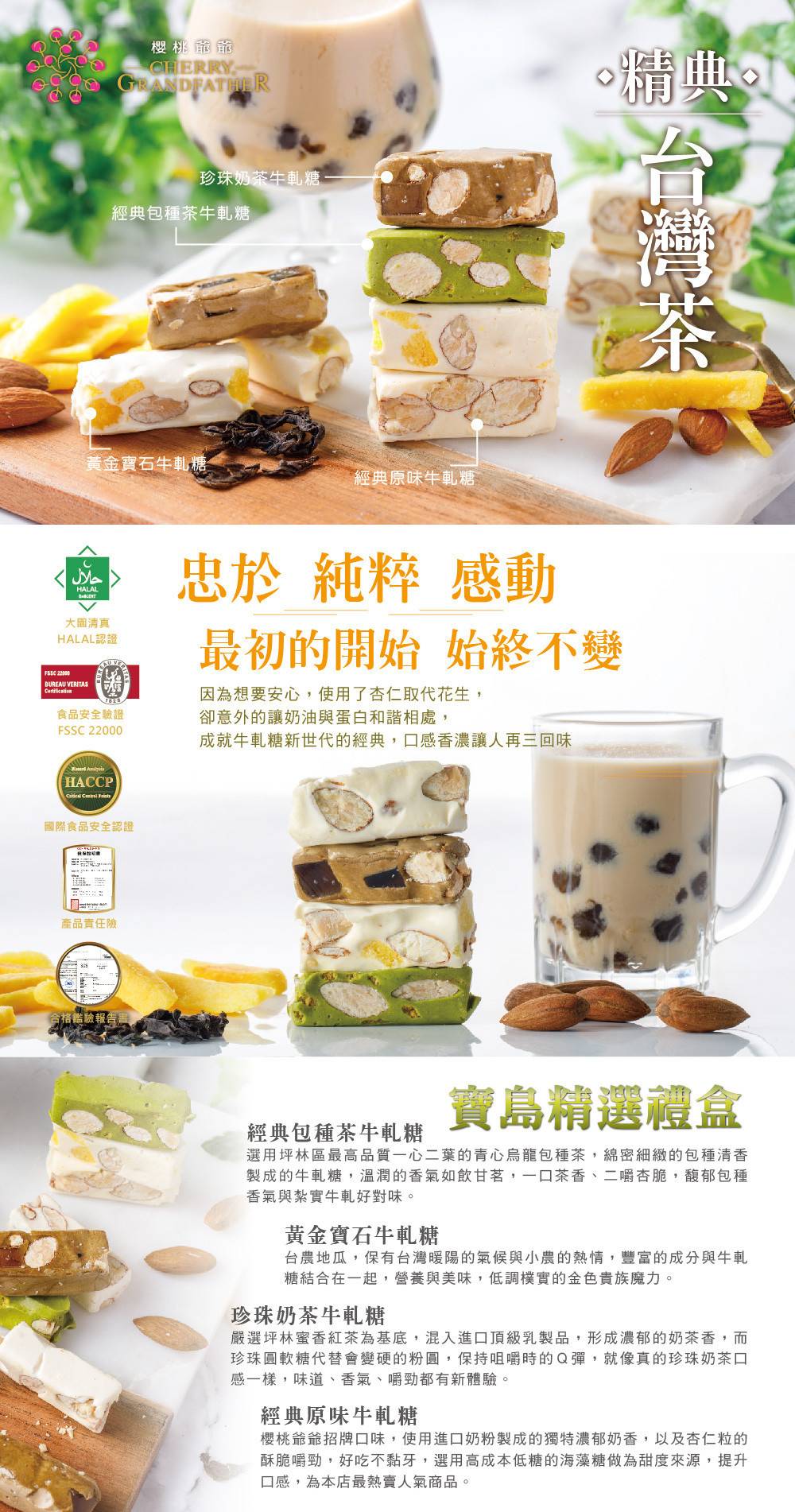 櫻桃爺爺,牛軋糖,手工,無添加,珍珠奶茶,包種茶,黃金寶石,地瓜,禮盒,伴手禮,年節禮盒,牛軋糖禮盒,Halal清真認證,蔓越莓,愛文芒果,台灣農產,天然水果,紐西蘭乳源