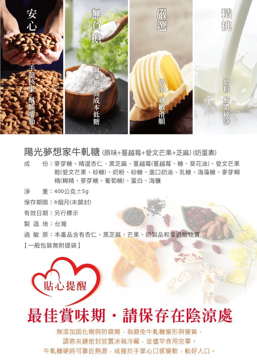 陽光夢想家牛軋糖(原味、蔓越莓、芒果、黑芝麻) 400g